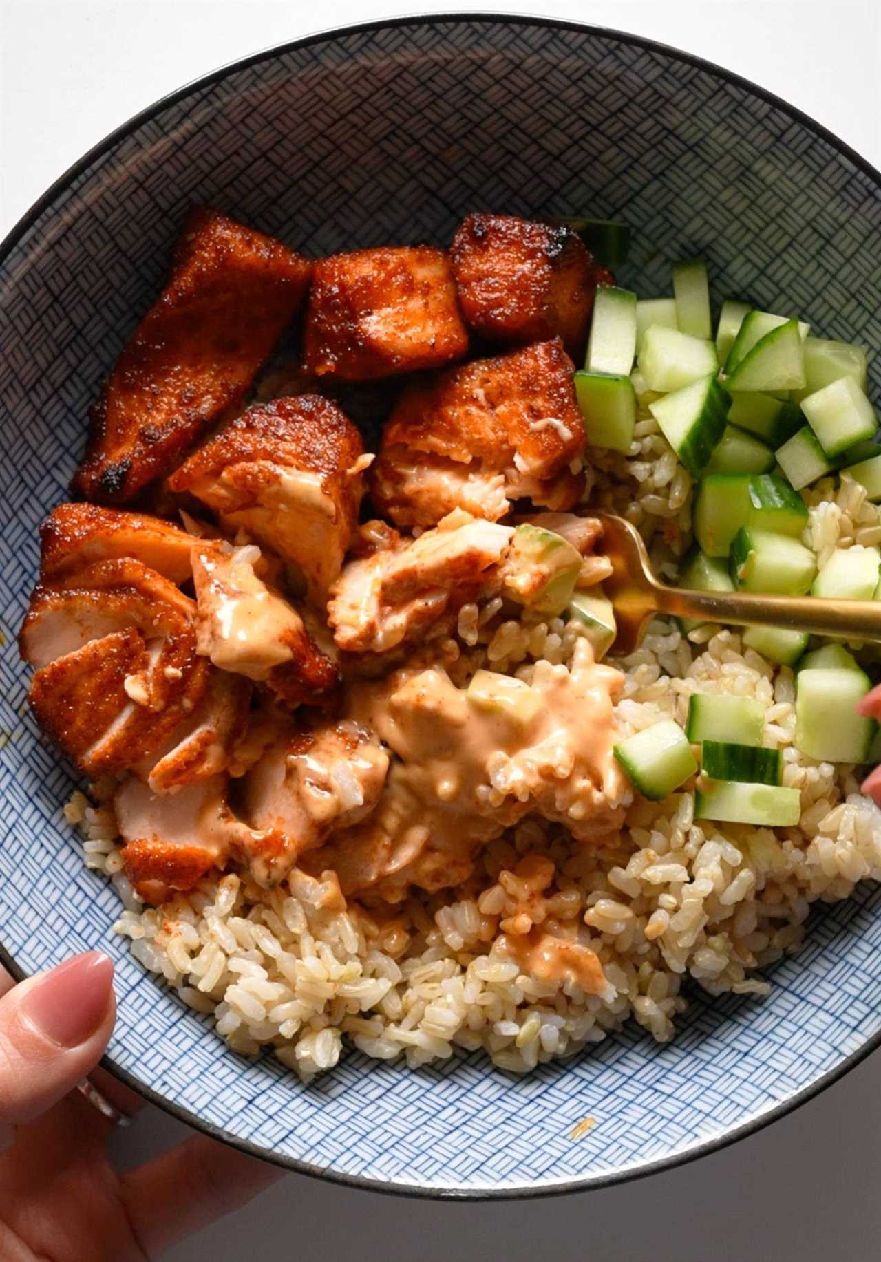Bang Bang Salmon! Creamy, sweet, savory, and punchy. Served with some steamy rice and an avocado cucumber salsa. Weeknight perfection!